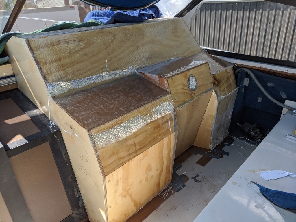 I did a bit more work on the helm. The fiberglass that is hanging over the edge gets trimmed off before I add more.