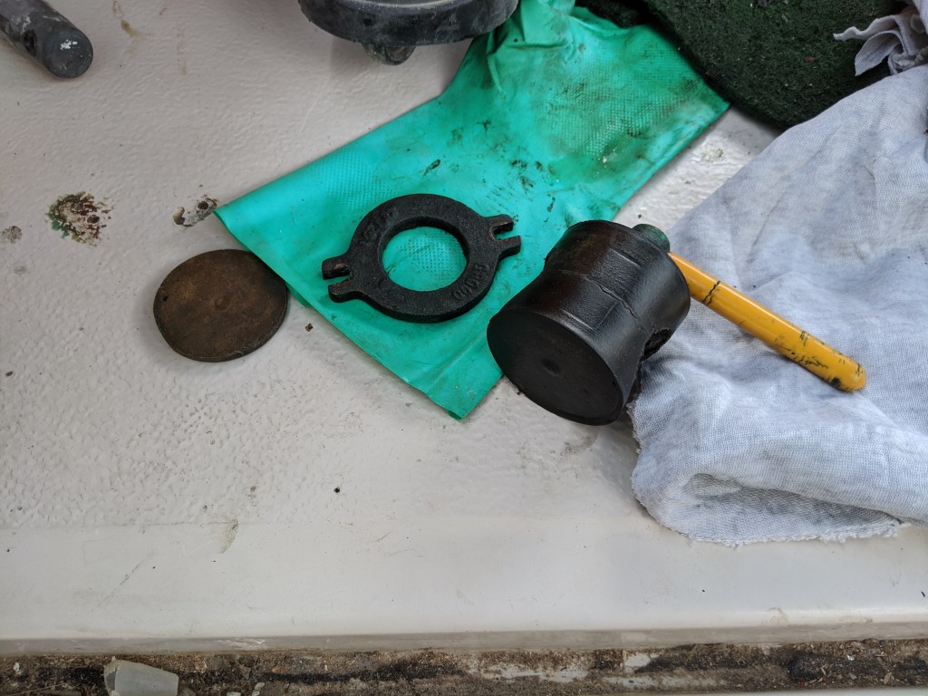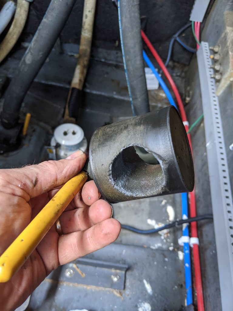 In this photo the rubber cylinder is partially inserted into the housing. On the back of the housing you can just see a smaller handle which basically just turns a threaded rod that presses on the flat plate. This causes the rubber cylinder to compress which causes it to increase in width which in turn seals the housing … stopping the seacock from leaking.