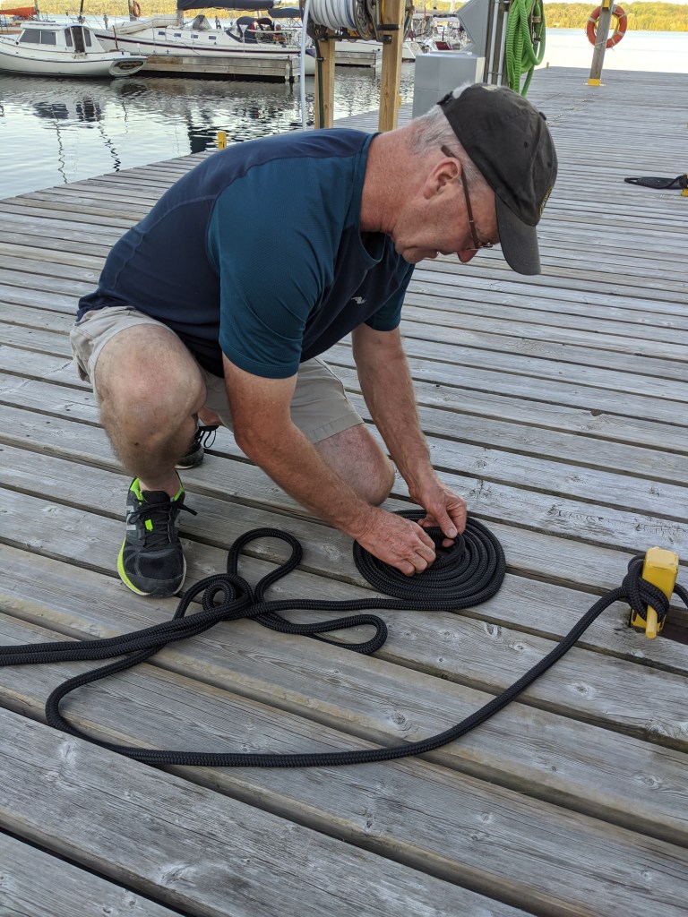 Donald is learning the lost art of spiraling the rope at the cleat. Jason was very strict about making sure we did this on our trip last year.