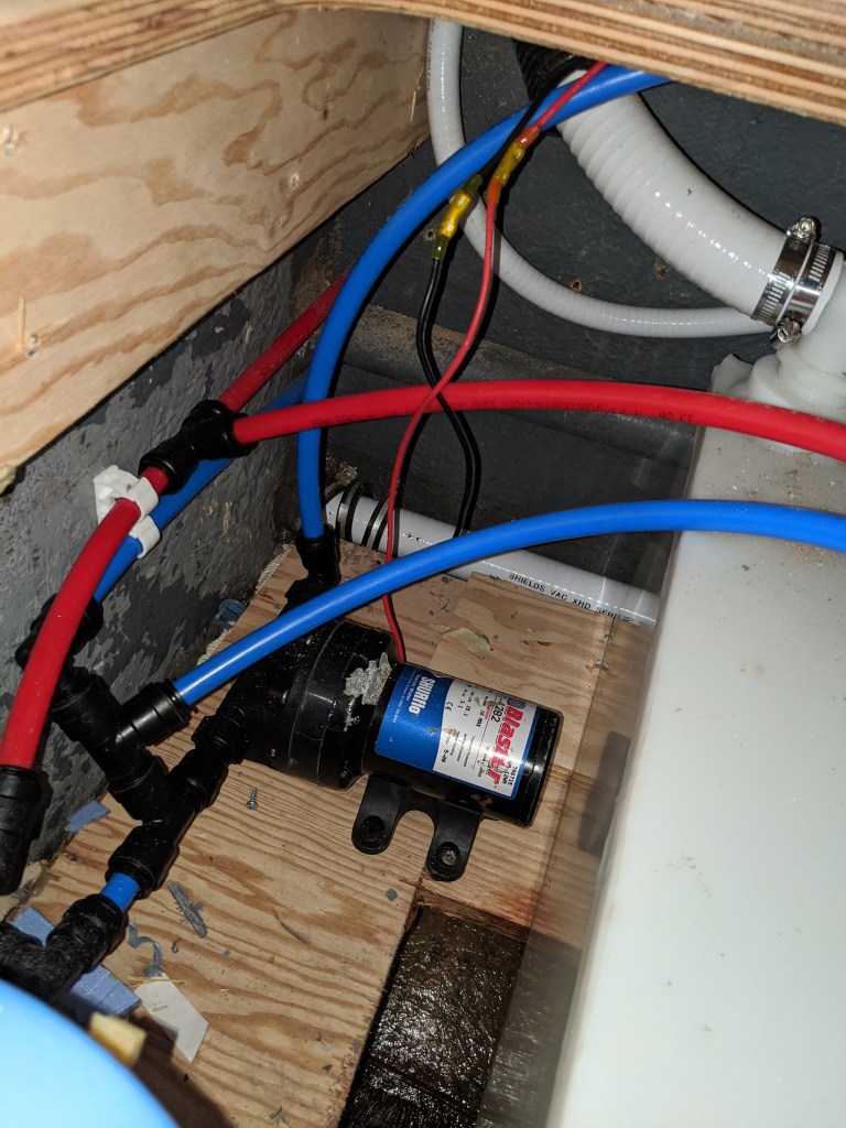 Since I didn’t actually put water into the tank via the outlet on the side of the boat there was no reason for it to have water in it. To cut to the chase I think that the person who did my plumbing found the existing water pump and reused it. I was definitely very specific about only using new parts for the water and electrical systems.