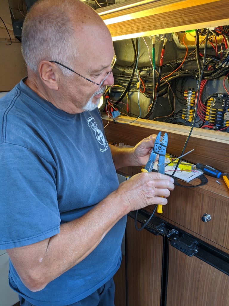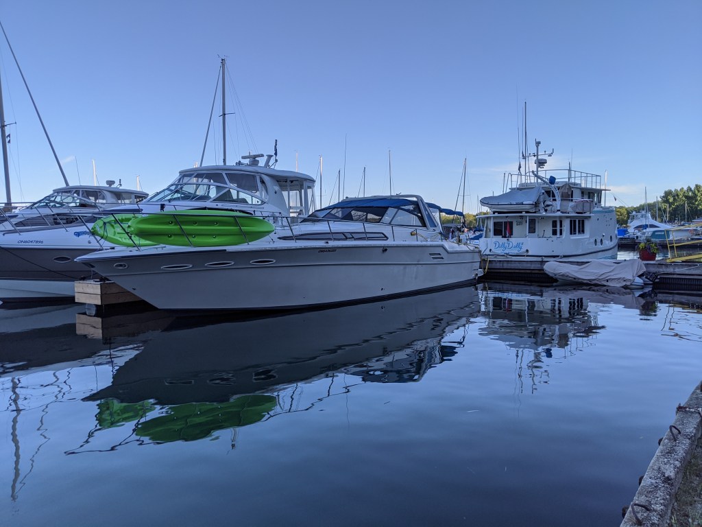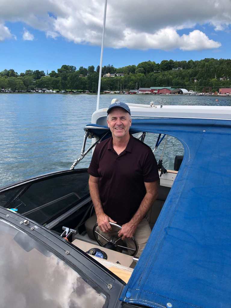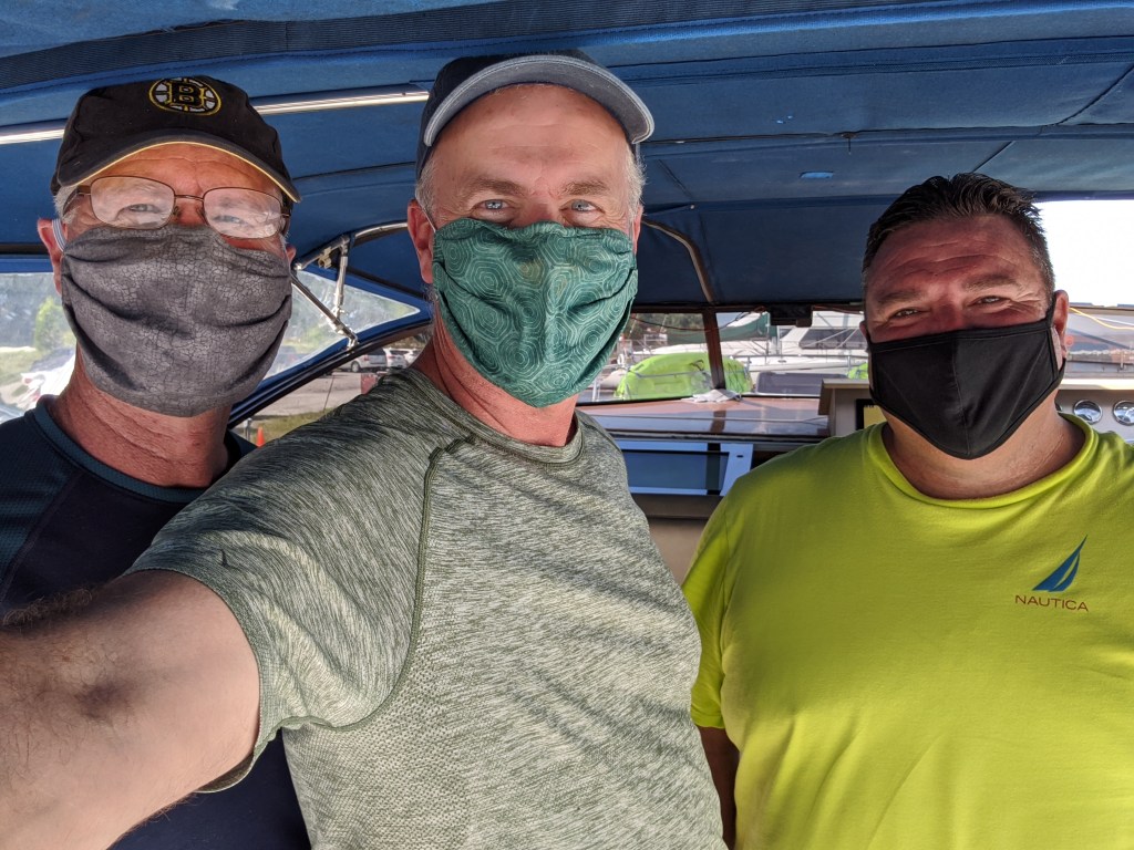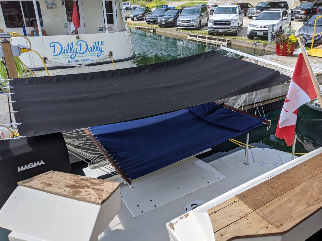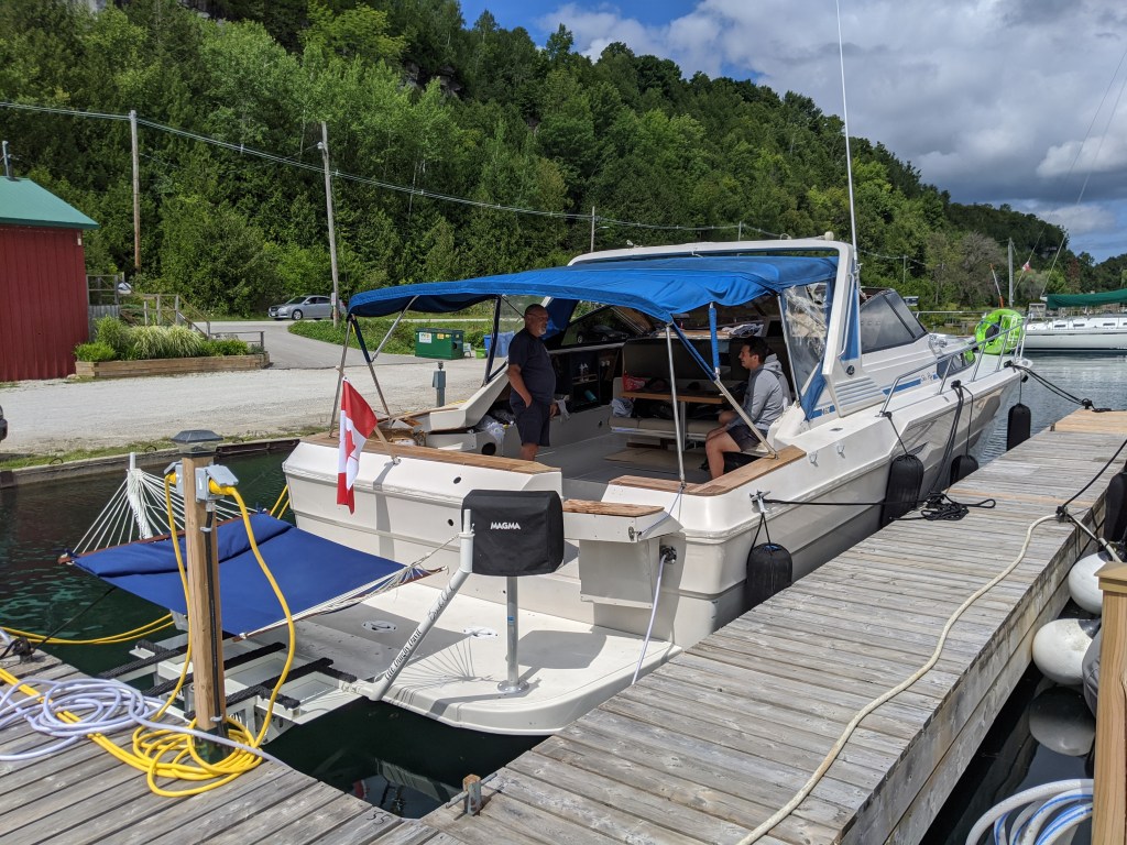 Our friend Jeff made the trip from Goderich for this auspicious occasion to help hook up the temporary in-hull transducer and to make sure that she actually left the marina without any loss of life and property.
