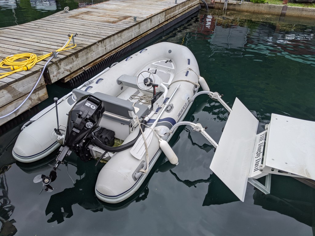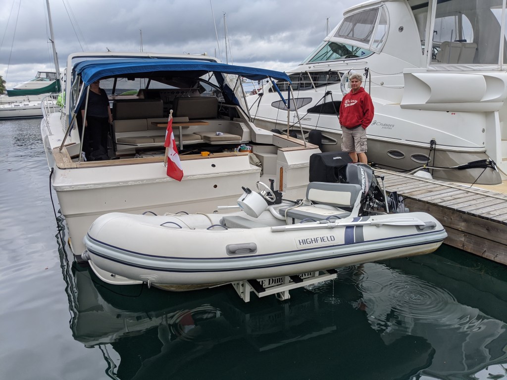 A few weeks ago our friends John and Gail came for a visit and they helped me get the dinghy up on the davit for the first time. I was a bit nervous because I had just installed the d-ring patches. Never did anything like that before and these patches were going to be pulling about 450 lbs on to the platform.