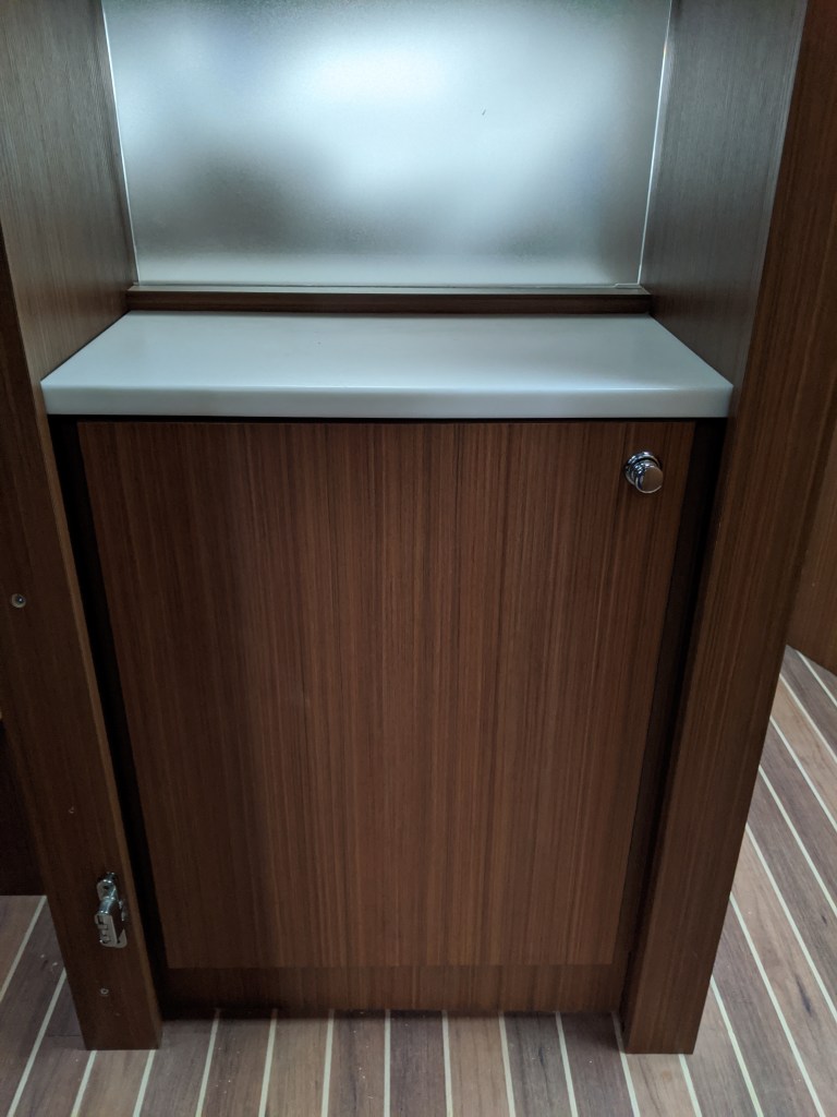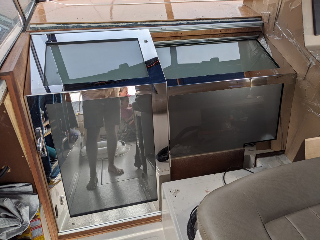 We installed two more of the mirrored stainless panels on the sliding door to the lower berth. The final one on the backside of the actual door will be a little trickier to put on and are hoping to get to that one next weekend.