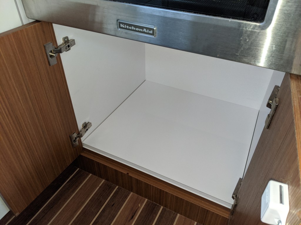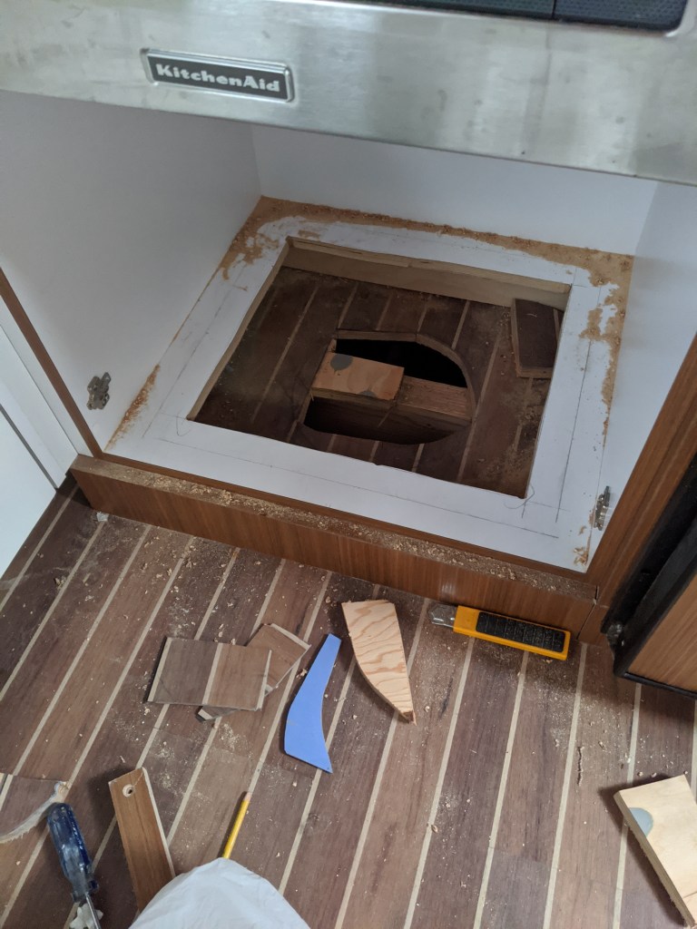 One of the things I wanted to get done was cut an access in one of the cabinets in the galley so that I can see if there was any water trapped below. I could see every other part of the hull except for a section on the starboard side. I was very sure there was some water down there since we have a small leak in the bulkhead in the galley.