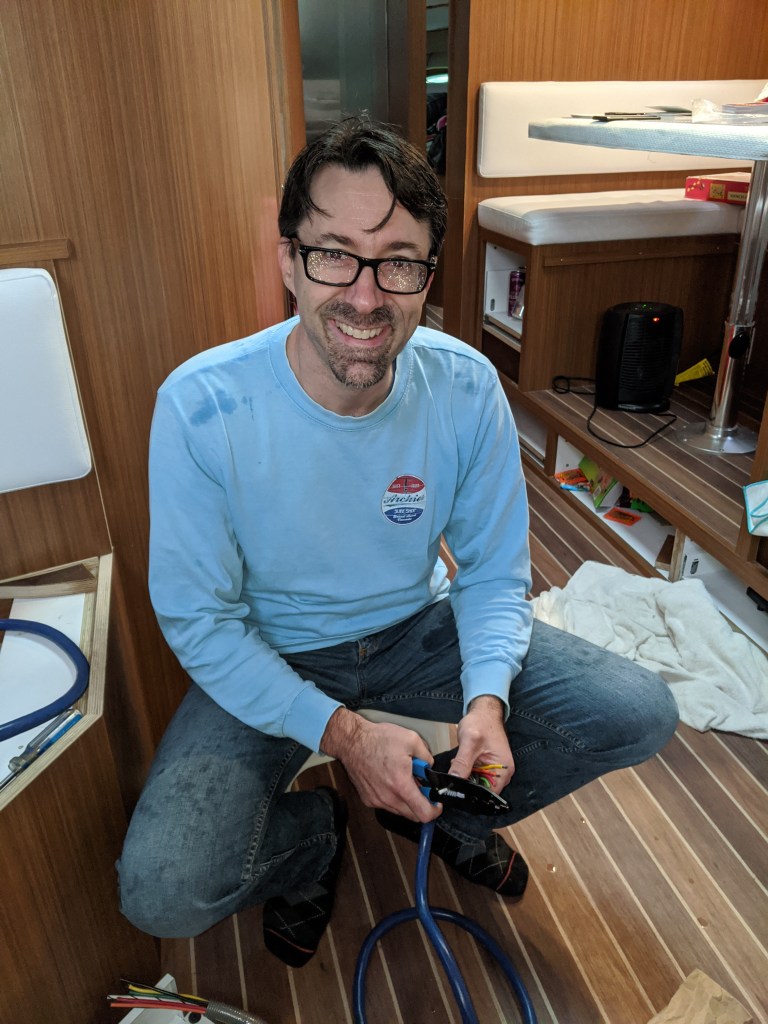 The marina will be taking care of some of the things on the list (and it’s a long one) like the installation of the bow thrusters, finishing the gelcoat on the helm, gelcoat repairs to the exterior of the boat, getting the trim tabs working and installing and extra set of tabs, and installing the windlass.