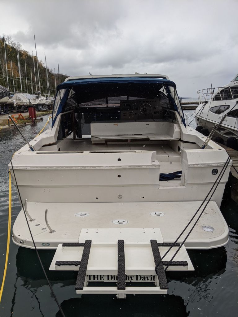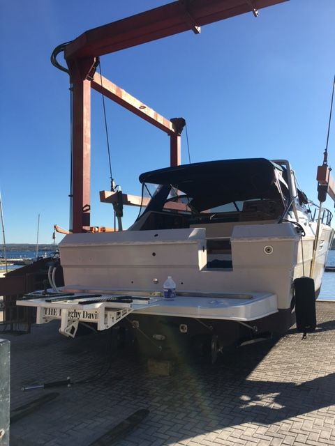 We found out that she was a bit too long for her to fit in their shop so they had to remove the swim platform.