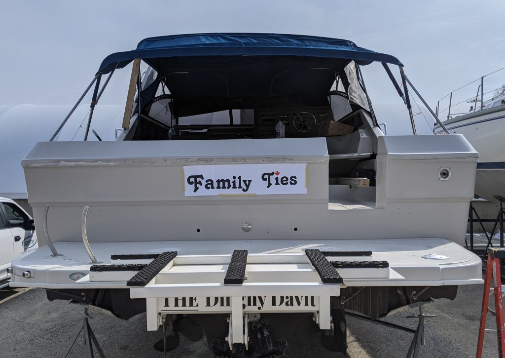 It was a very heavy door that we had to lift onto a little shelf when we wanted to close it. It was big and sagged when open … a terrible design. We had the marina fill in that little ledge and match the profile of the transom. They did a great job.