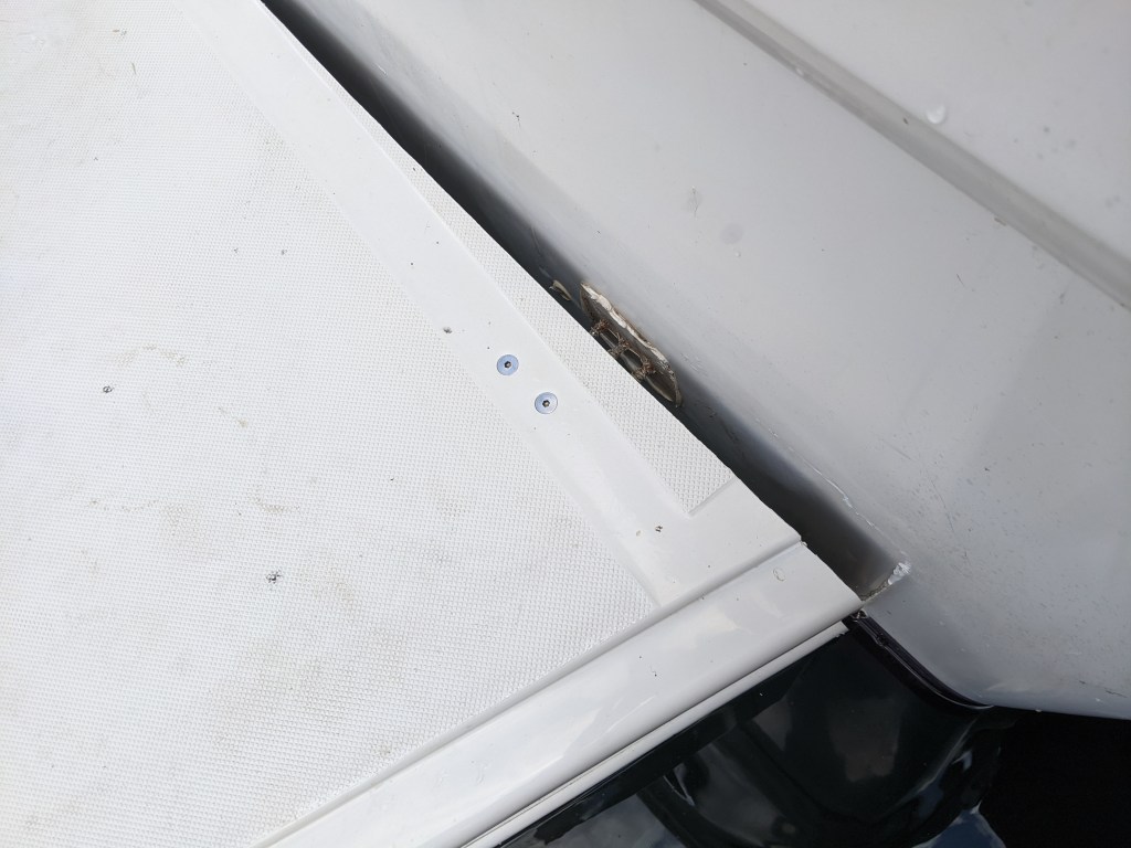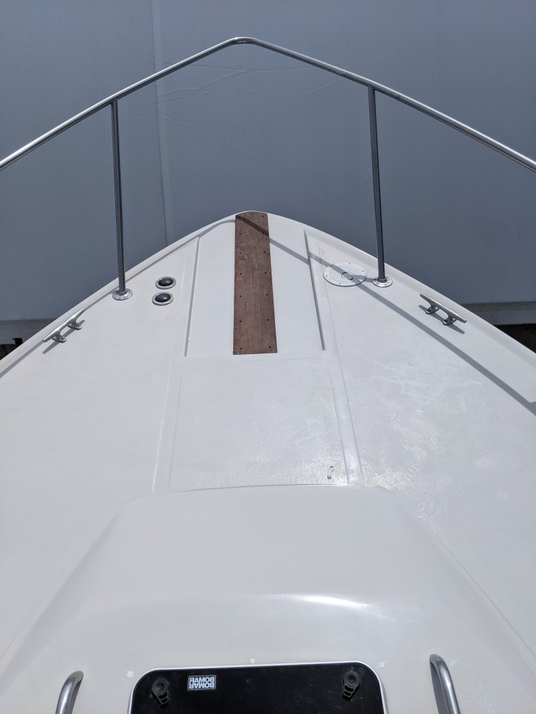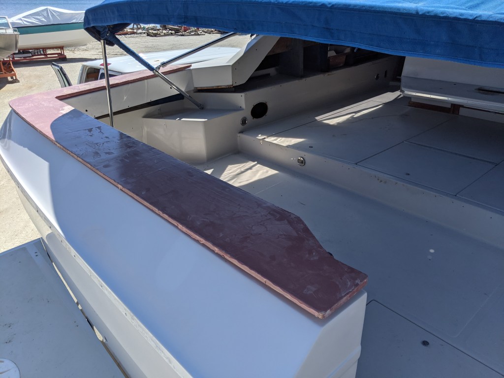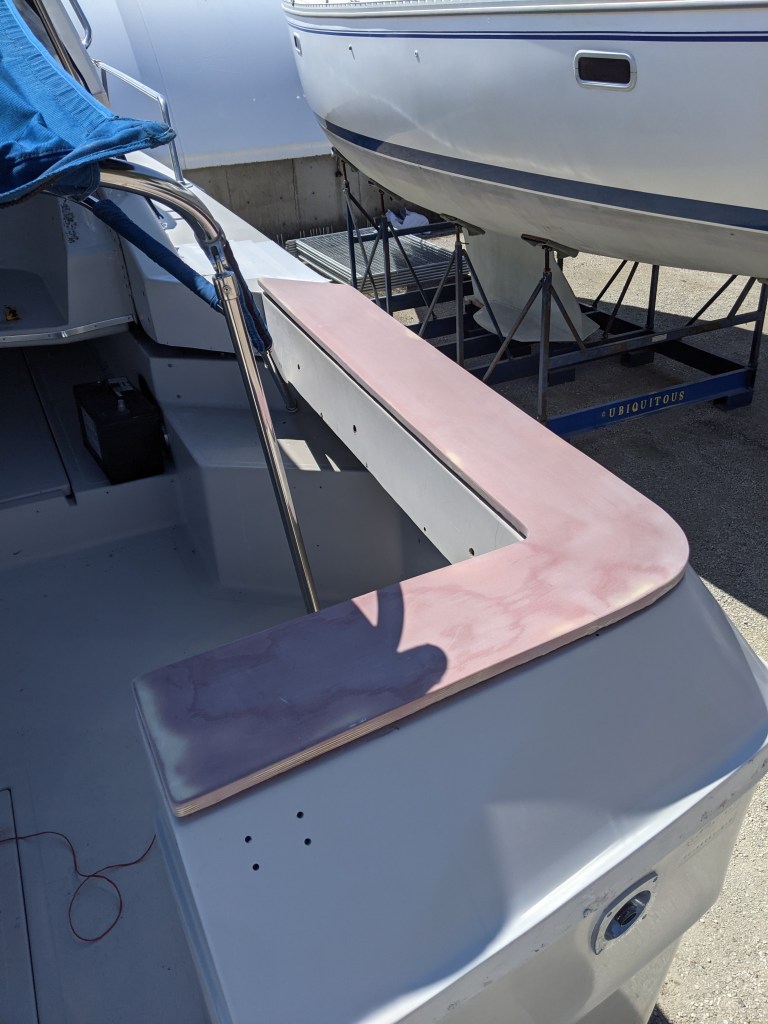 I was pretty happy with how they turned out. Now I can finish sanding them and spray them with the gel-coat that the marina is supplying. They will blend into the transom nicely now. I need to have these reinstalled before we head to Lefroy to get fitted for the new bimini.