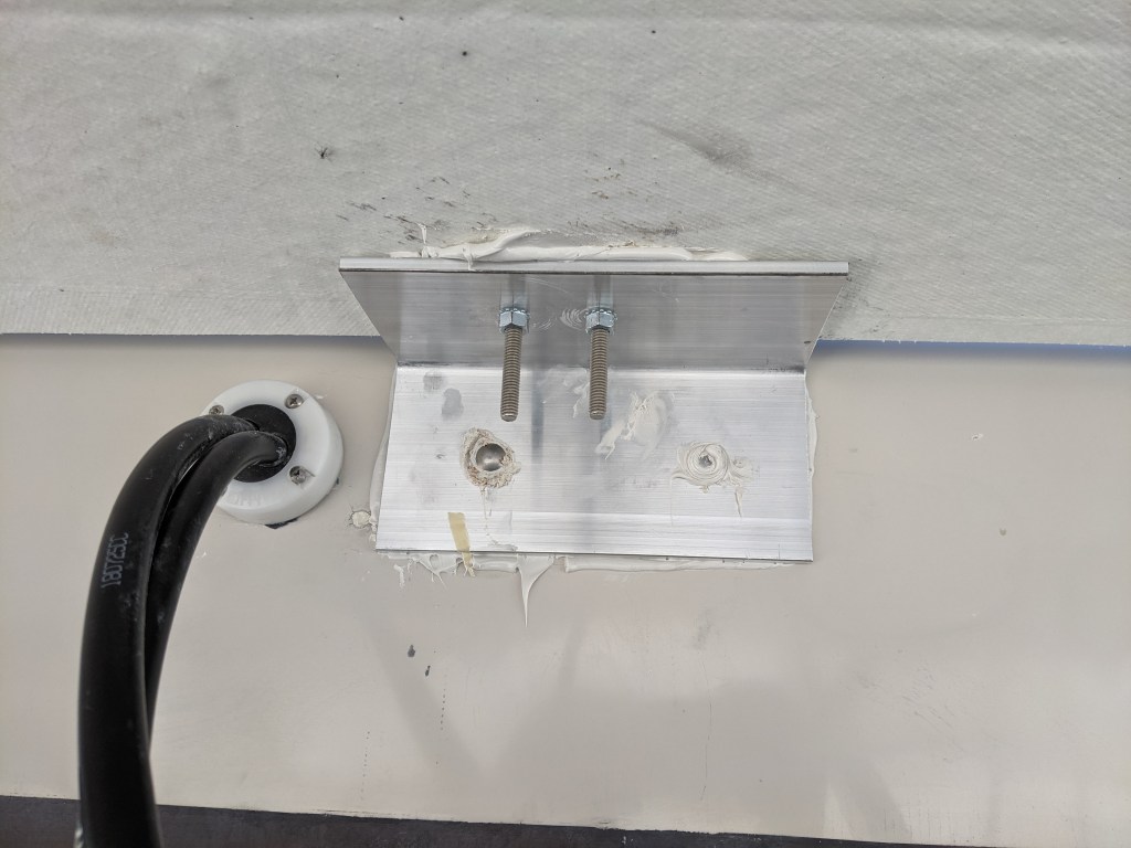 Now that we had the chance we attached it with 1/4″ aluminum brackets with 1/4″ plates on the interior side of the transom. We used 3/8″ stainless bolts with washers and locknuts.