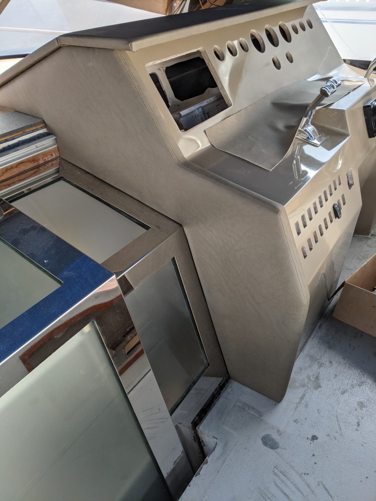 Finally here is a shot of the helm all new and shiny. On the side is the end panel that we had covered in the same fabric that is on the seats. The tops pieces are finished in the same way. The panel has stitching on the edges and fits perfectly. The gelcoat on the helm matched the piece of fabric that is stretched over the helm which is one shade lighter than the seats. It’s hard to tell in the light but it is a great match. Once we have the gauges in place I will take a better shot. Very happy with how it turned out.