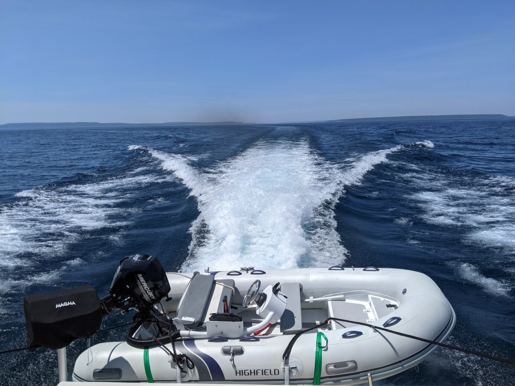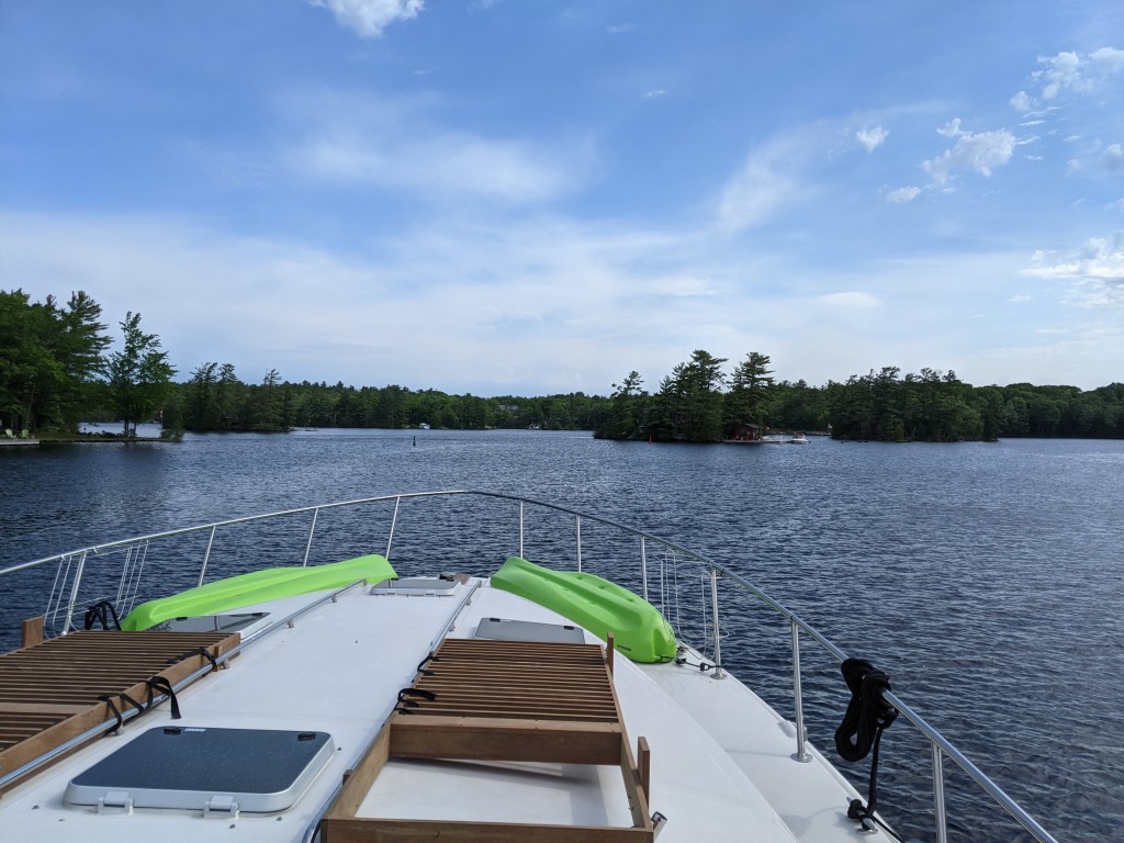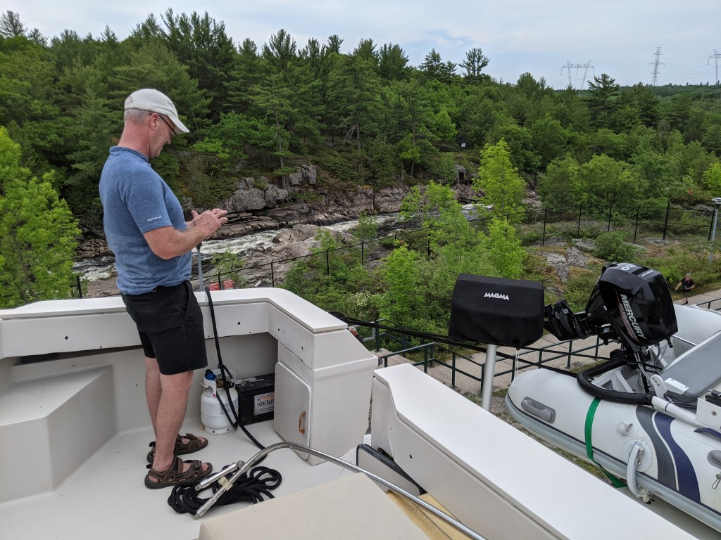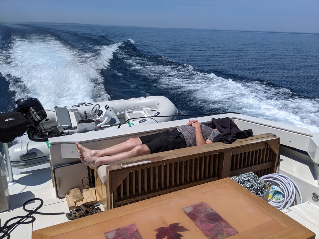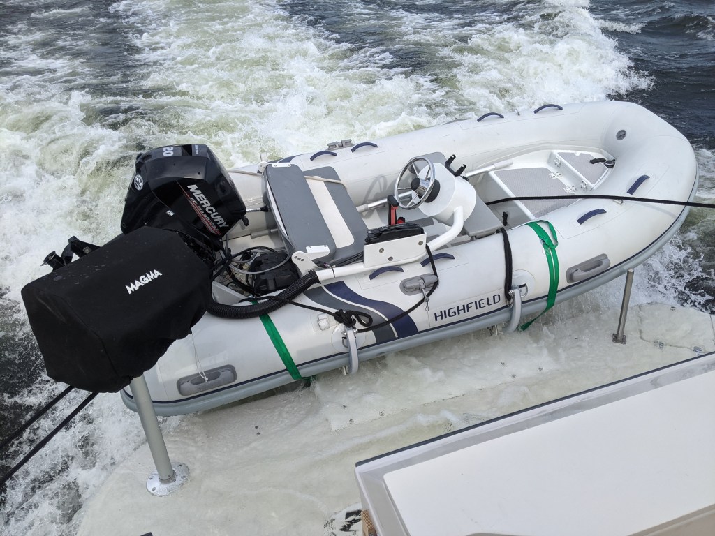 We hadn’t left Colpoy’s Bay when we needed to deal with the dinghy. At 8 knots we weren’t on plane yet and the bottom of the dinghy was catching a lot of the wake. You can see it washing over the platform. We had to angle the port side of the dinghy higher so that it didn’t catch as much water. Once we hit 10 knots everything was fine. I will have to figure out a way to get the dinghy to sit higher on the davit.