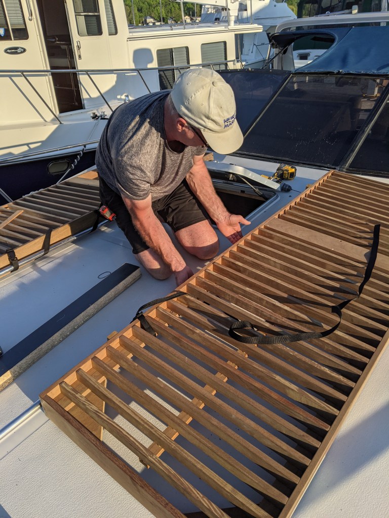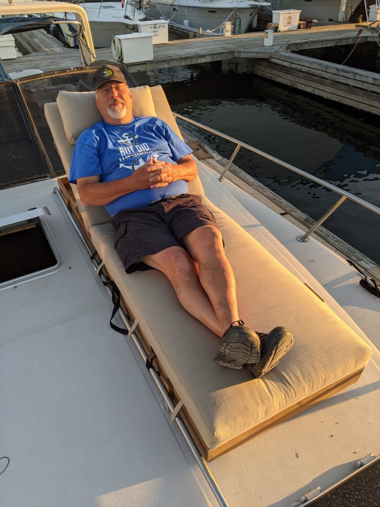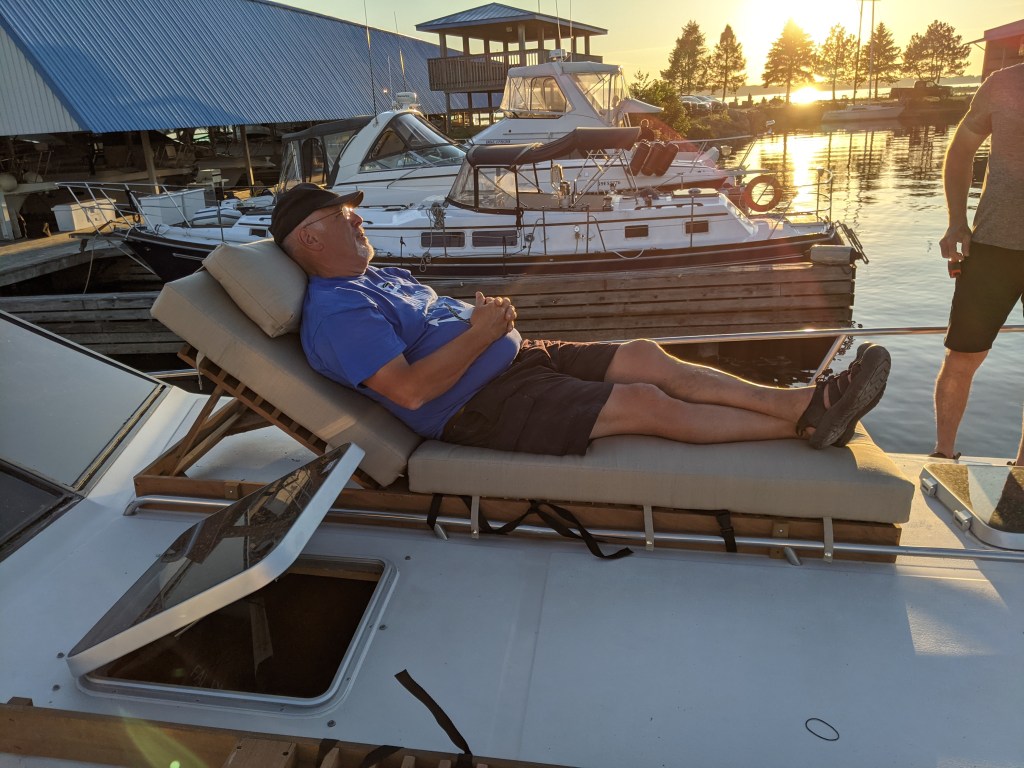 After supper Donald and I set up the lounge chairs on the bow. I will be bringing these back to the shop in the fall to finish them off. I had to bring them along so that we could get a canopy made in Lefroy (more on that in the next post).