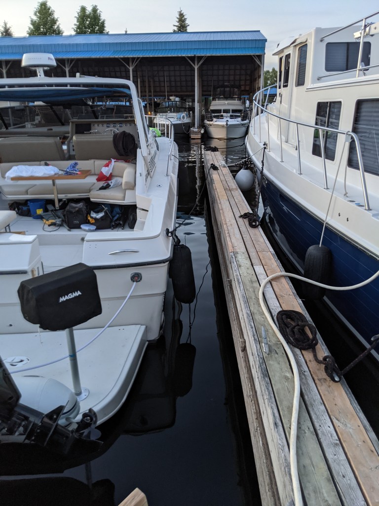 I was a bit nervous as I approached the slip and had to back away on my first attempt but I did manage to split the uprights on my second. It definitely feels very good when you finally get to shut the engines down once you are tied off.