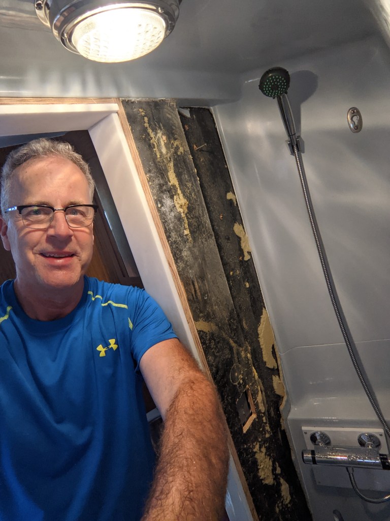 We also have a working shower! No more nightly trips to the cramped marina showers. We have our own cramped shower now.