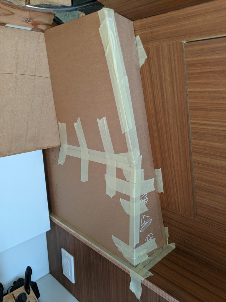 I also made a cardboard template to finish off the corner of the galley. Once this piece is done I can make the bulkhead headliners.