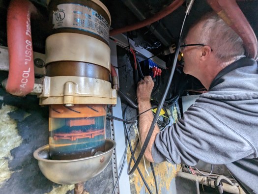 We needed to remove the various filters and battery chargers and hoses and thingys first, install a small section of plywood, and then reinstall the doohickeys. I hate to get all technical on you but it’s how I roll. I will not dumb this down for you.