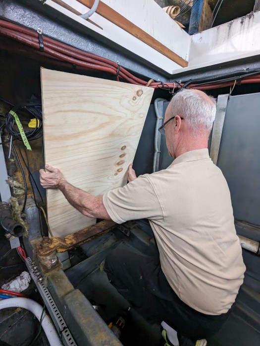 Donald and I installed plywood on the wall that separates the engine room from the living area.