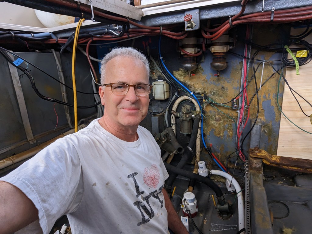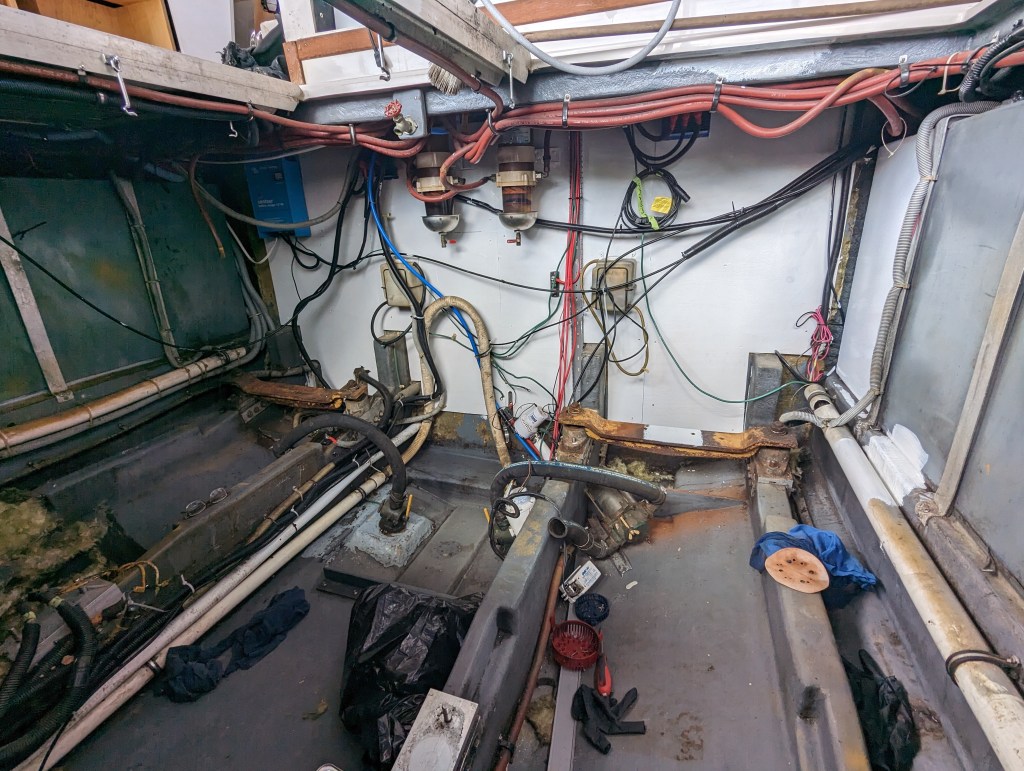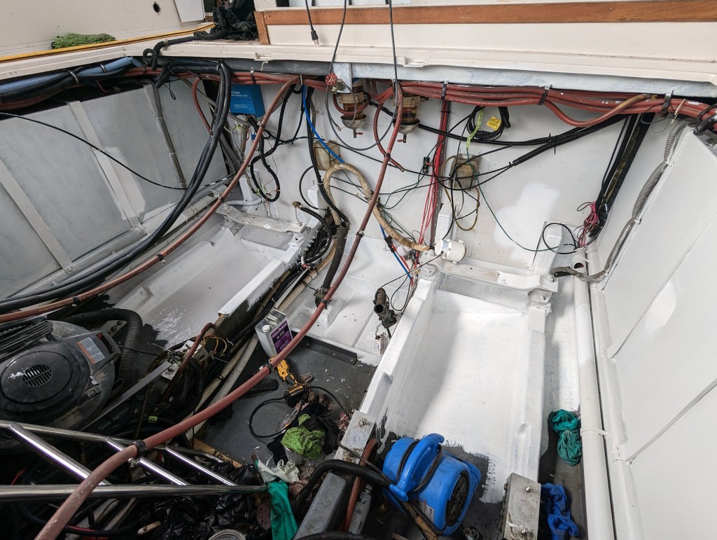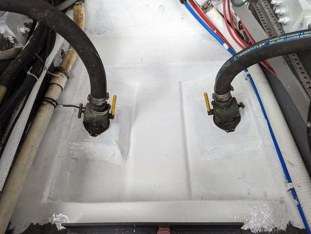 I managed to get 3 good coats of Bilgekote on the areas that I won’t be able to reach once the engines and generator are back in.